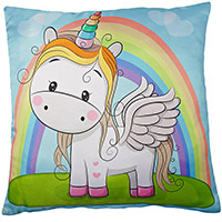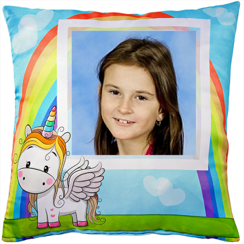 Vankúš s jednorožcom, z jednej strany predtlačený motív pre vloženie fotografie, a z druhej strany jednorožec s dúhou. Súčasťou vankúšika o rozmere 40x40cm je aj výplň. Samotný potlač je umiestnený v predtlačenom tvare. Vankúš je príjemný na dotyk. Obe strany sú saténové. Uzatváranie na zips.